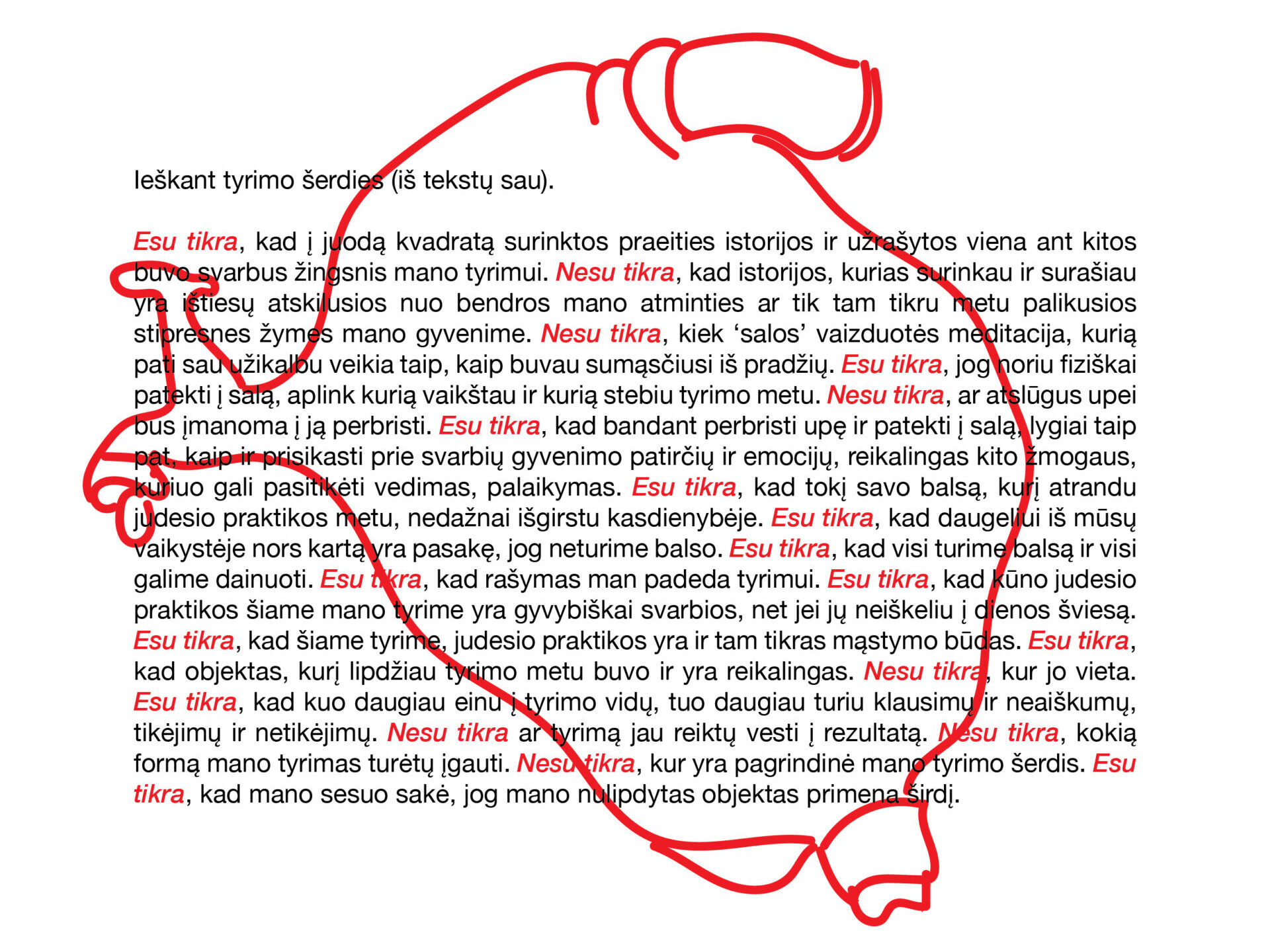 „Prieš pradedant tyrimą bičių platformoje, jau turėjau surinkusi tam tikrą dalį teorinės mokslinės medžiagos. Dažnai noriu būti teisinga, nesuklysti, nenukrypti nuo mokslinių faktų, tačiau būtent todėl per šį tyrimo laiką leidau sau interpretuoti, atsispirdama nuo mokslinių faktų pažiūrėti, kur mane nuves meninė intuicija. Kartais netgi jaučiuosi spekuliuojanti, kaip pavyzdžiui susikurdama sau sąlygas ir aplinkybes, iš kurių turėtų kilti judesys. Juk viskas priklauso absoliučiai nuo mano vaizduotės ir kiek aš sugebėsiu patikėti tuo, ką pati įsikalbu. Iš čia kyla tas įdomus paradoksas tarp tikėjimo ir žinojimo, riba, kuri yra labai reliatyvi. Ieškodama savo tyrimo šerdies, pradėjau rašyti aspektus, kuriais tyrimo metu esu tikra, o kuriais ne. Pati nustebau, kaip malonu pasiūbuoti tarp tų dviejų polių „esu tikra, nesu tikra“.“