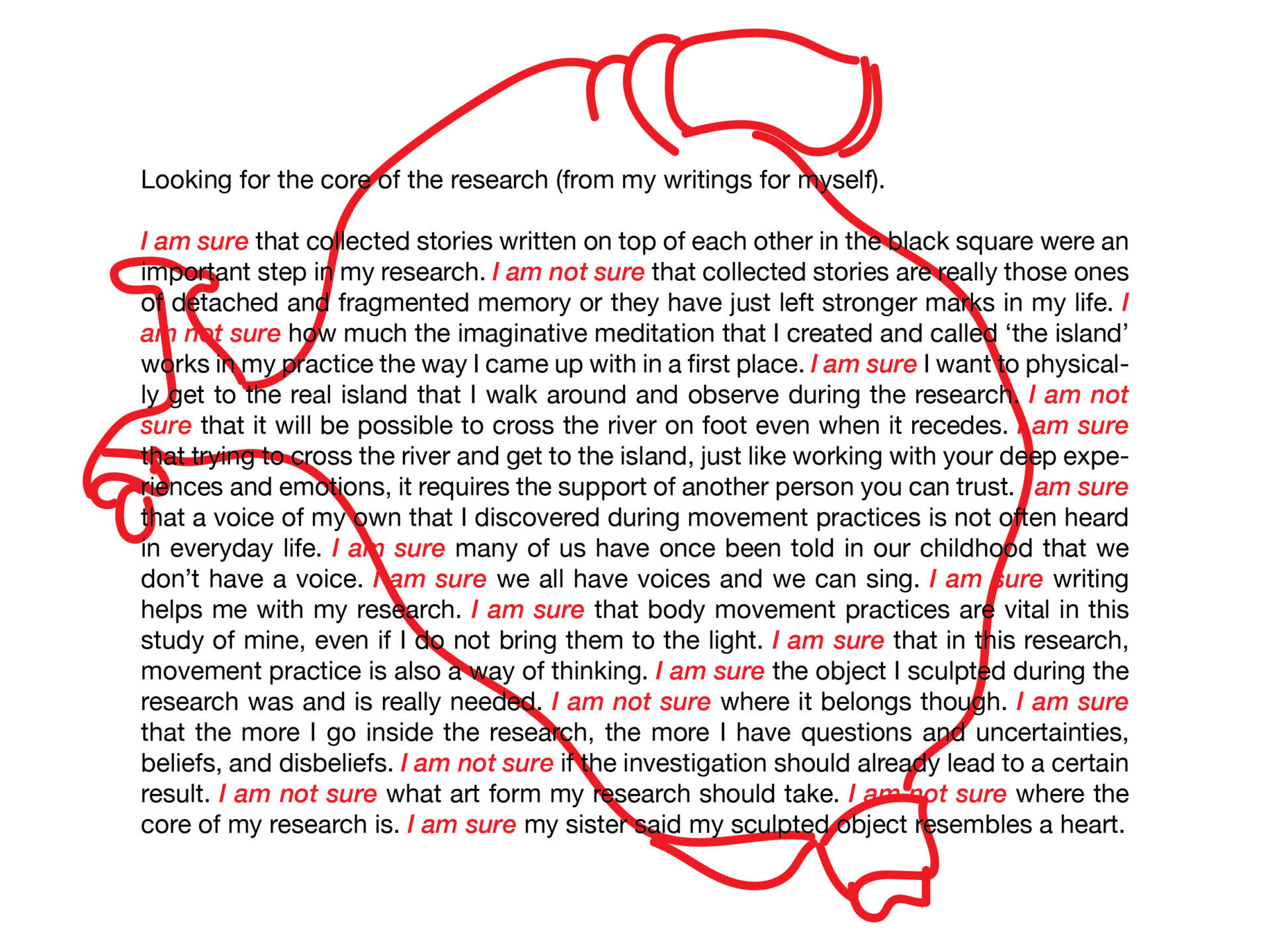 „Mano tyrimas turi tris kertinius taškus, tris erdves: sala, juodas kvadratas ir nulinė būsena. Sala – tai fikcinė, įsivaizduojamų aplinkybių įtakota erdvė, kurioje žmogus atsiduria praradęs atmintį, nesuvokdamas, kaip čia pateko, nežinodamas jog yra žmogus, neprisimindamas savo praeities. Čia, pamažu, iš naujo patirdamas aplinką ir save, jis ima prisiminti tam tikrus savo asmeninės ir bendrus žmonijos atminties elementus. Juodas kvadratas – atsikartojantis elementas sutinkamas mano piešiniuose, kuriuos jungiu kartu su judesio praktikomis, bei laisva minčių tėkme, išreiškiama tekstu ir balsu. Mano veikimas šioje erdvėje yra vedamas pagrindinių klausimų: ką man daryti su juodu kvadratu? Ir kaip man išjudinti juodą kvadratą? Trečioji erdvė – tai nulinė būsena, kurioje susitinka praeitis ir dabartis, fikcija ir realybė, pasipriešinimą keičia priėmimas. Visos trys erdvės, tai lyg pereinami kambariai, kuriuose šiuo metu vaikštau, leisdama laisvai cirkuliuoti orui, tačiau ketinu kiekvienoje užsibūti ilgėliau ir atidžiau jas ištyrinėti.“